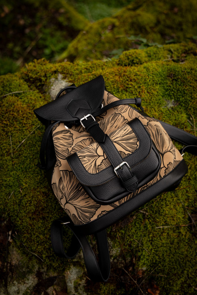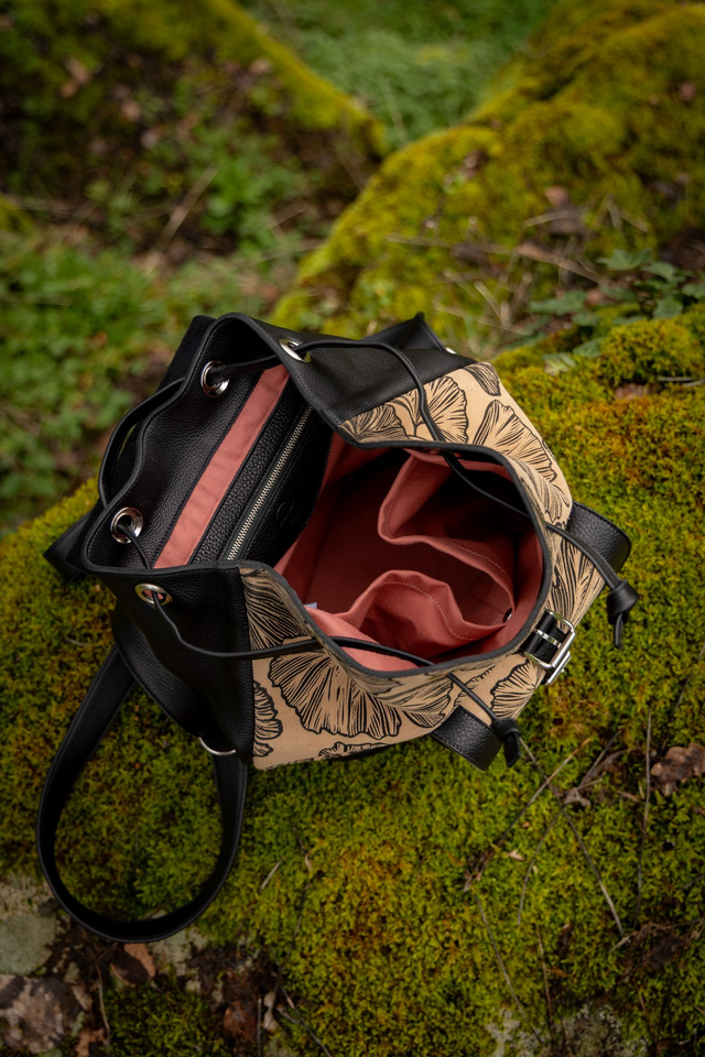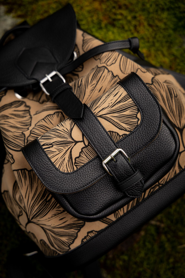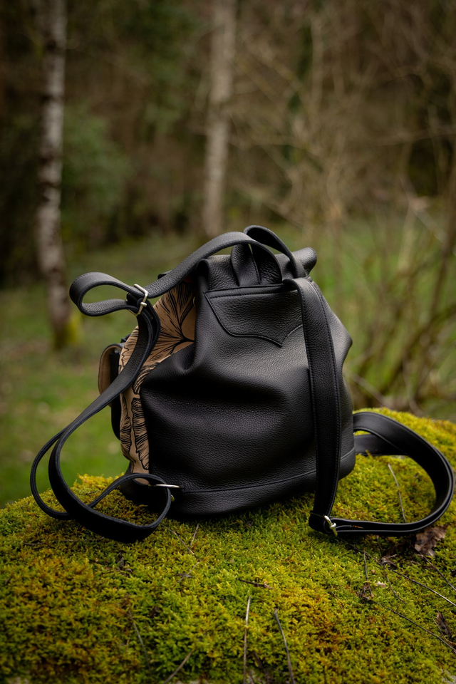 Sac à dos en cuir noir grainé et croute de cuir peinte à la main.