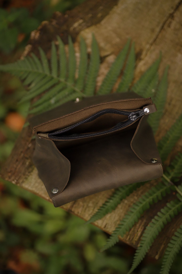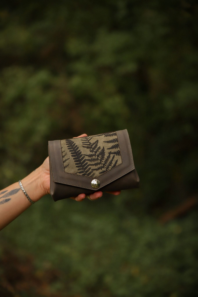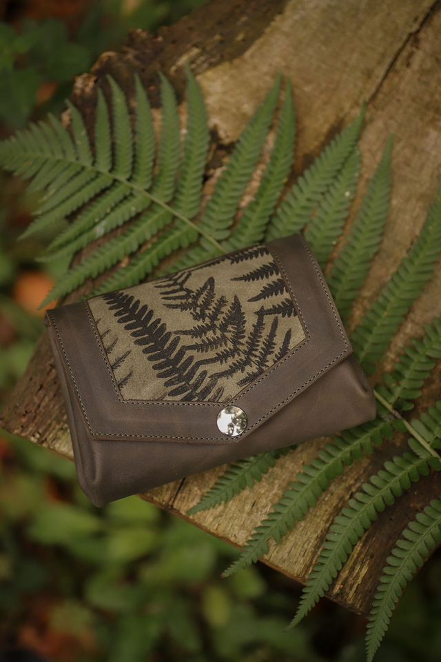 Empiècement sur le rabat en croute de cuir avec impressions de vraies fougères avec la technique du blockprinting.