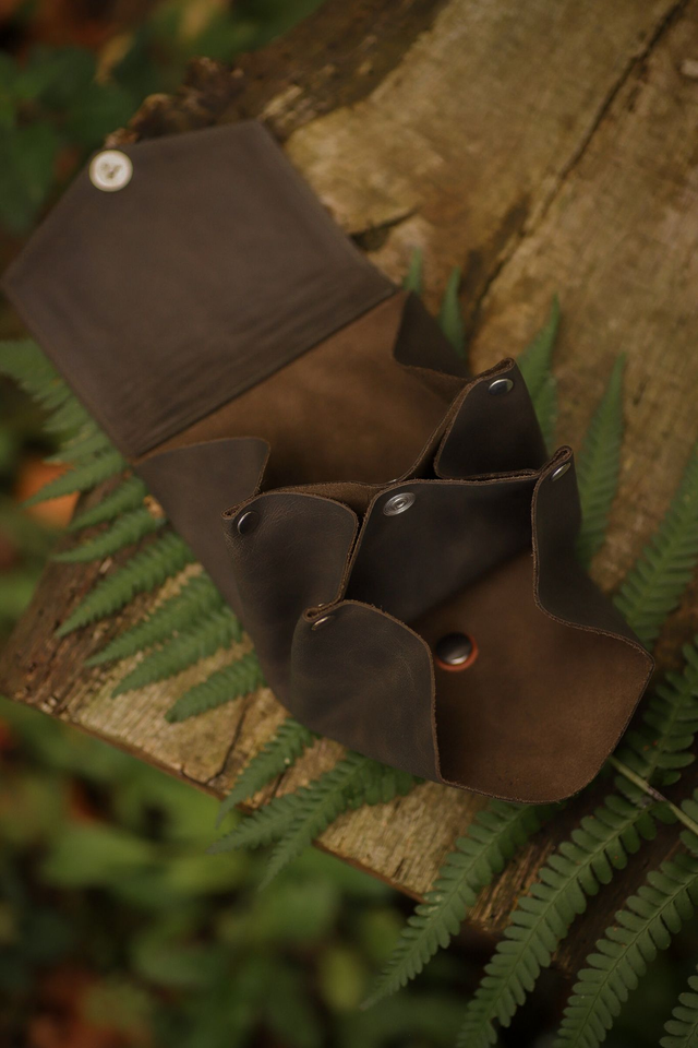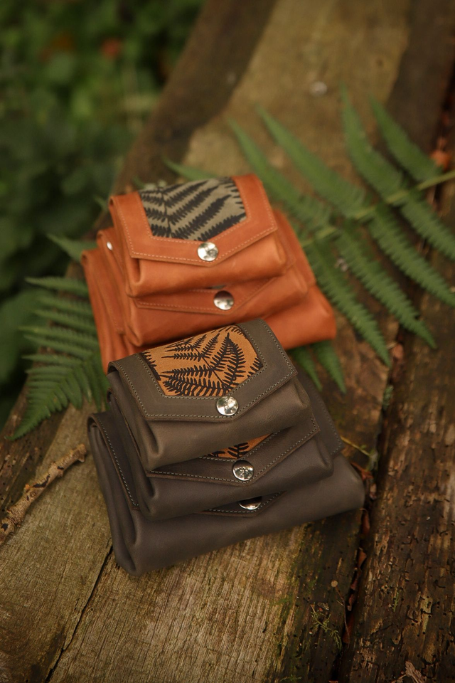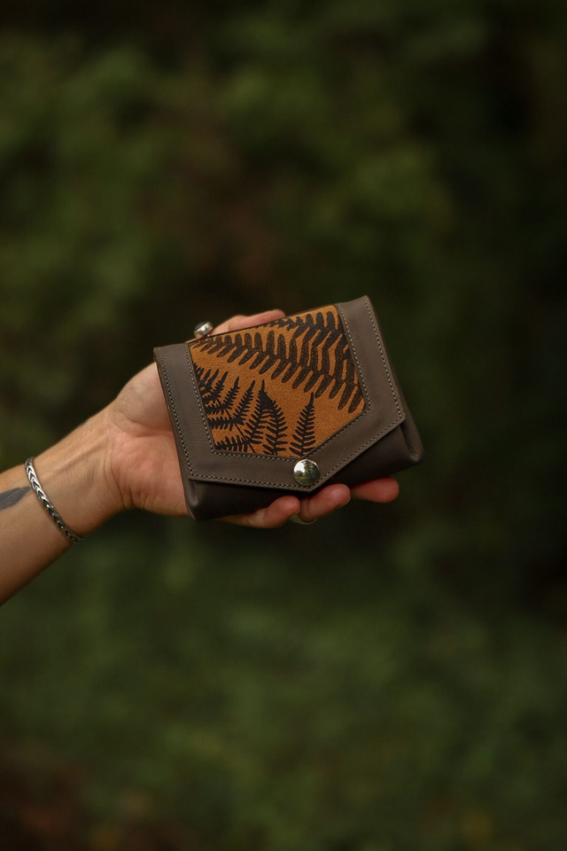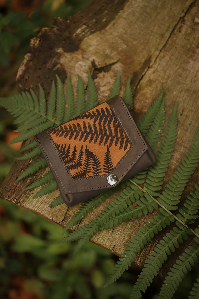 Empiècement sur le rabat en croute de cuir avec impressions de vraies fougères avec la technique du blockprinting.