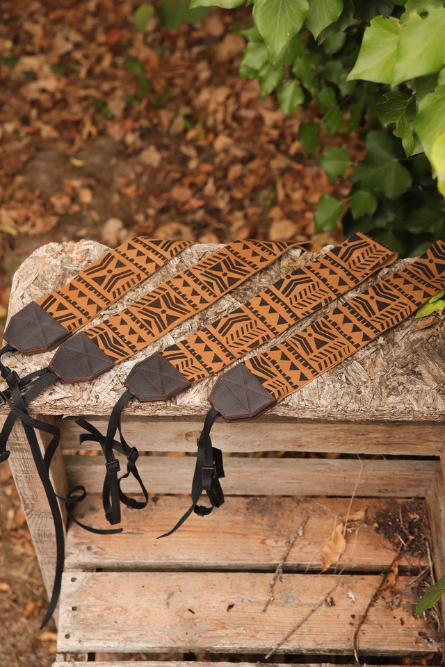 Partie principale : bande de confort en croute de cuir , imprimée à la main (blockprinting), et renfort en cuir pleine fleur de couleur marron.