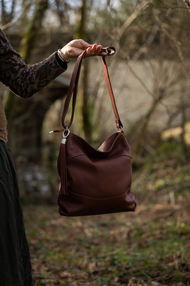 Matériaux : Cuir de veau lisse de couleur marron chocolat, doublure en coton.